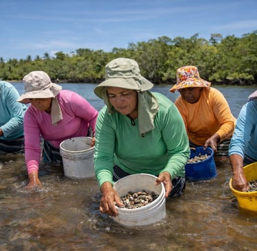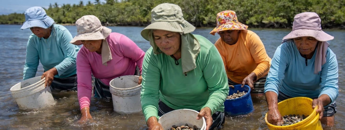 As marisqueiras representam a base invisível da cadeia produtiva. São elas que coletam, limpam, beneficiam e comercializam o pescado. Muitas também lideram associações comunitárias, organizam cooperativas e sustentam suas famílias quase sozinhas.